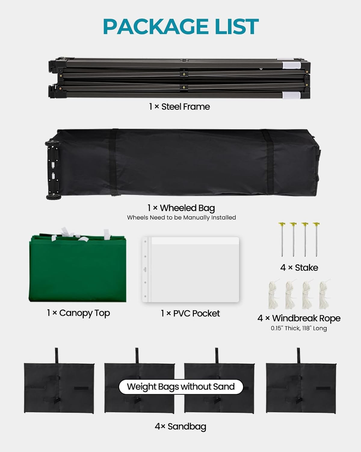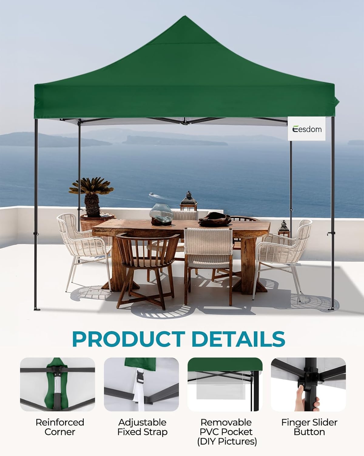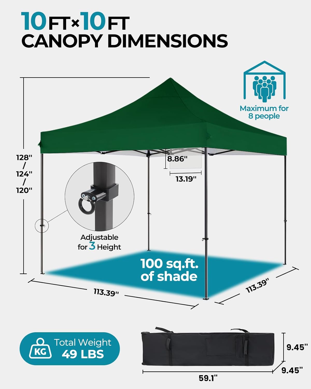 10in x10in Canopy Tent with Wheeled Bag, Commercial Portable Pop Up Tent, Easy Set Up, 4 Stakes & 4Sandbags & 4 Ropes, Waterproof Outdoor Shelter for Market, Parties, Forest Green