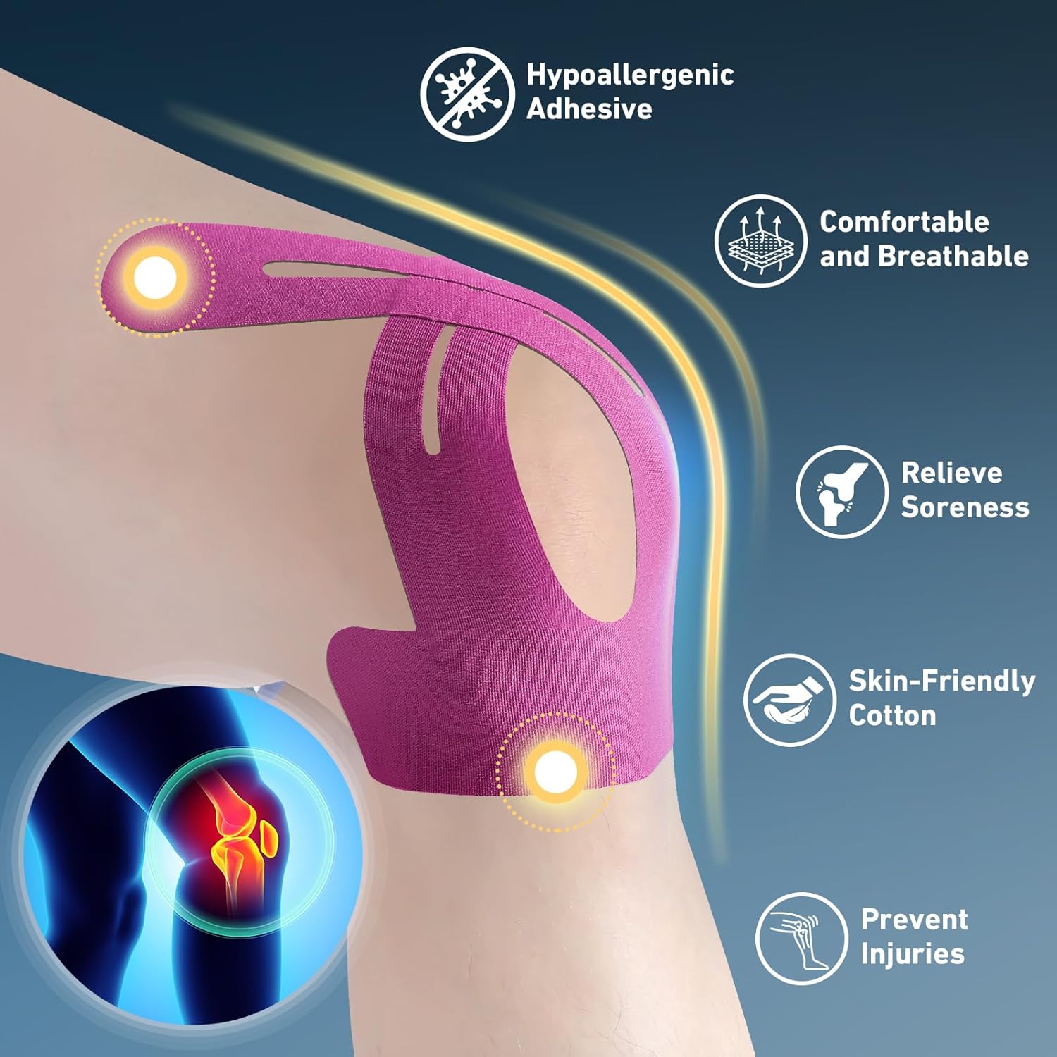 BREATHABLE AND SKIN-FRIENDLY COMFORT – This k tape for knee features improved airflow and a hypoallergenic design to prevent irritation. The athletic tape is lightweight and flexible, ensuring all-day comfort.