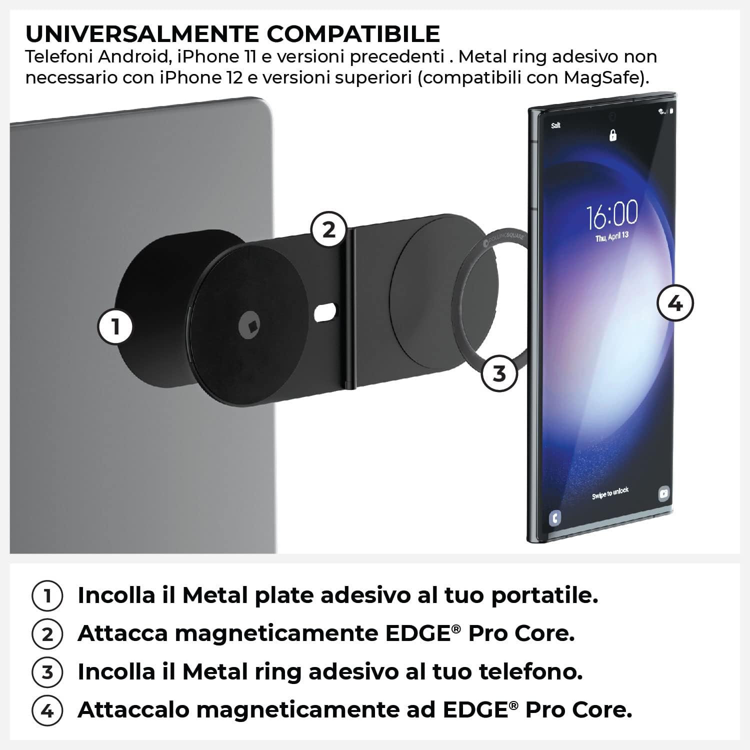 Universal Compatibility – Compatible with MagSafe and Non-MagSafe Devices Edge Pro Core works with Apple MagSafe devices and Qi-enabled phones. Non-MagSafe devices can be easily attached using the included adhesive metal rings for a secure fit, making it versatile for both older and newer smartphones. EDGE Pro Core is as thin as 2 credit cards when in use. With a minimum thickness of just 2.5mm, EDGE Pro Core is the perfect companion for leisure or remote working.